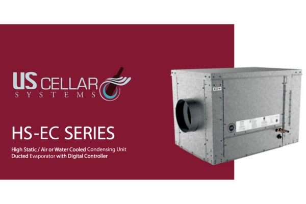 HS Series wine cooling units deliver powerful, ducted air up to 25 ft away—quiet, space-saving, and ideal for medium-high temp cellars (1,800–20,000 BTUH, R134a).