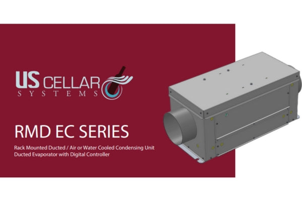 RMD EC Systems cool medium/high temp spaces with low-profile, insulated units mounted outside the cellar. Ducted, quiet, 1,800–7,200 BTUH, supports multiple refrigerants.
